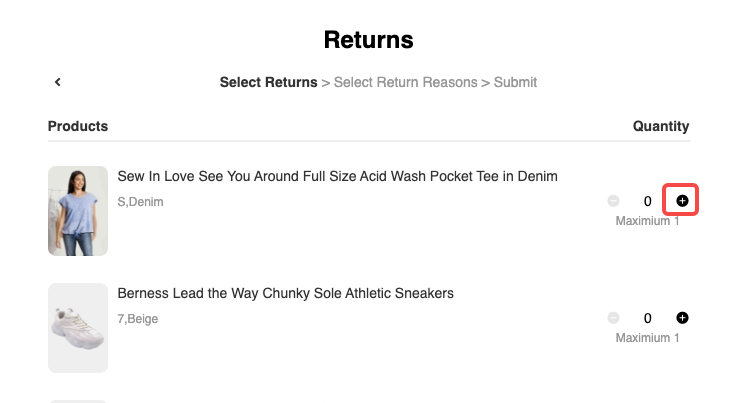 - Adjust the quantity for each item you are returning and click continue